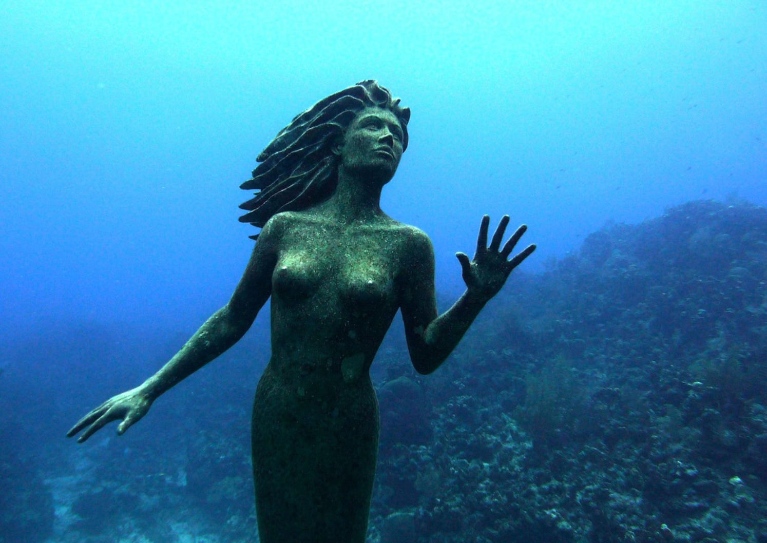 15 metres beneath the waves off Grand Cayman Island sits Amphitrite. This bronze mermaid is a 2.7-metre tall sculpture created by Simon Morris in 2000 and is named after Poseidon's wife. Amphitrite was a Greek goddess who ruled as queen of the seas, and was the mother of Triton and of seals, dolphins, and other sea creatures. She has become a beloved destination for divers, as has her identical twin, The Emerald Princess who lives in Powell River, British Columbia.