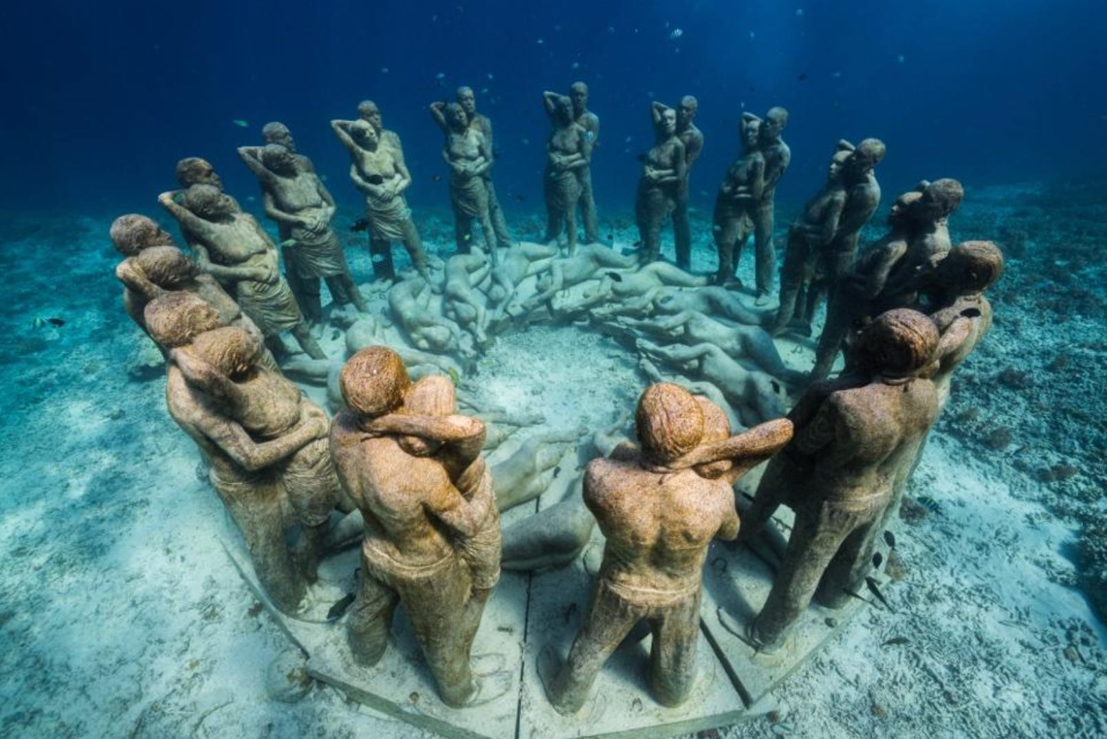 The world's first underwater sculpture park lies in Molinere Bay, Grenada, where 75 extraordinary works (created primarily by artist and ecologist Jason deCaires Taylor) are spread across 800 square metres of seabed. Created in 2006 after Hurricane Ivan devastated the area, these pH neutral sculptures sit 5-8 metres deep, providing a new foundation for marine life to flourish. Among the most celebrated pieces is Vicissitudes — a ring of children from diverse backgrounds holding hands as they face the ocean currents, symbolising unity and resilience. Now listed as one of National Geographic's 25 Wonders of the World, this underwater garden shows how art and conservation can work in perfect harmony.